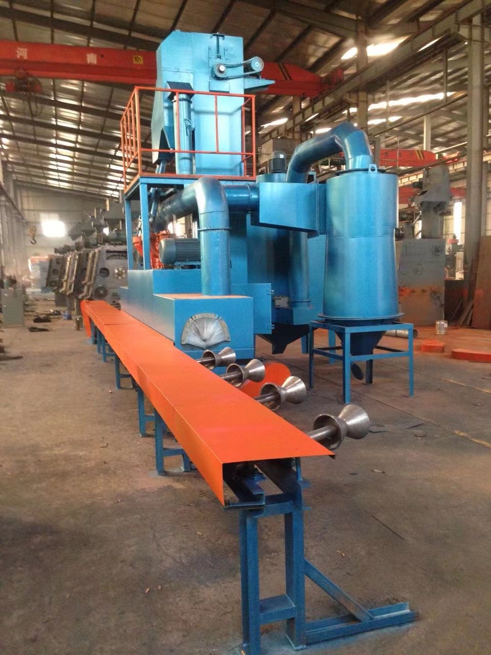 鋼管拋丸機(jī)是一種用于不同尺寸鋼管內(nèi)壁處理的新型清洗設(shè)備。它有處理能力。可根據(jù)不同管徑選擇不同的拋丸或拋丸設(shè)備,其中拋丸由液壓馬達(dá)驅(qū)動(dòng),拋丸由起動(dòng)馬達(dá)驅(qū)動(dòng)。 我公司設(shè)計(jì)了大直徑內(nèi)壁拋丸機(jī)和直徑小于600mm的小鋼管拋丸機(jī)等。 該設(shè)備采用自動(dòng)拋丸清除表面銹跡,利用拋丸裝置拋出的高速噴丸流擊碎鋼管內(nèi)表面的氧化皮、銹層和雜物,獲得細(xì)膩光亮的表面,提高工件的抗拉和抗壓強(qiáng)度,增加內(nèi)表面涂裝保護(hù)的附著力,達(dá)到防腐、護(hù)管、延長鋼管使用壽命的目的。 清洗后,工件的表面光潔度和粗糙度符合相關(guān)標(biāo)準(zhǔn)。 小口徑鋼管采用內(nèi)壁拋丸機(jī)和鋼管內(nèi)壁噴丸加工線,主要包括移動(dòng)小車、砂斗、噴砂罐、噴槍、噴槍運(yùn)載車、鋼管運(yùn)載系統(tǒng)、底部拋丸輸送帶、斗式提升機(jī)、維修平臺(tái)、分離器、除塵系統(tǒng)、支架、氣動(dòng)系統(tǒng)、壓縮空氣系統(tǒng)和電氣控制系統(tǒng)。 該設(shè)備在輸送小車上配有氣動(dòng)上下料系統(tǒng),可實(shí)現(xiàn)兩側(cè)自動(dòng)上下料。工件放置在工作位置后,移動(dòng)密封室在減速器的驅(qū)動(dòng)下向固定密封室的方向移動(dòng),從而密封鋼管的兩端。